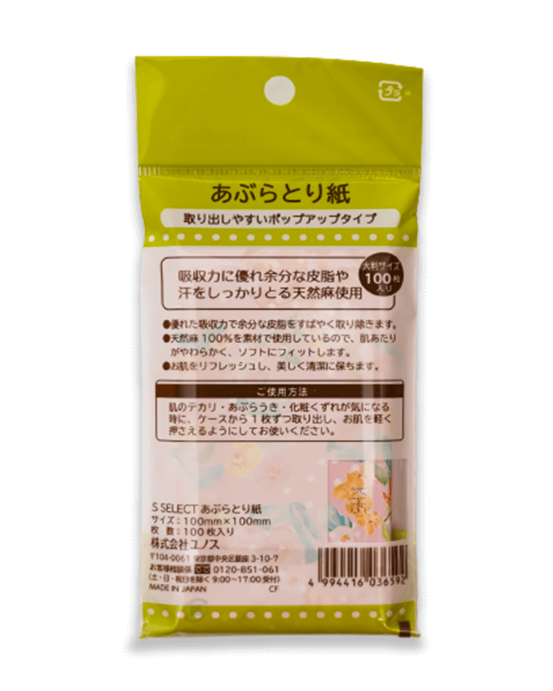 - Miếng giấy thấm hút dầu thừa S Select là trợ thủ đắc lực cho những cô nàng có làn da thường xuyên bóng nhờn. Thành phần 100% sợi gai dầu, có cấu trúc dạng sợi dài, nhỏ, với độ rỗng cao, giúp thấm hút dầu thừa trên da rất hiệu quả, cho làn da sạch thoáng, hạn chế bít tắc lỗ chân lông và ngừa mụn hình thành.